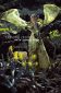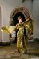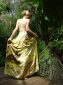Dieses lange rückenfreie Neckholderkleid mit weitem Rockteil ist mit dekorativen Falten an Vorder- und Hinterteil versehen. Der Federhalsschmuck für das Dekolleté oder den Unterbrustbereich ist abnehmbar. Das Neckholderteil ist hochwertig gefüttert. Das aufsehenerregende Kleid ist seitlich mit einem Nahtreißer zu schließen. Als Material wurde bedruckte Seide in hellgelb, cremeweiß, braun, grün verwendet. Dasselbe Muster findet sich auf dem Bolero mit kimonoähnlichen Ärmeln aus Chiffon wieder. Der Bolero ist am Rückenteil in Falten gelegt, die langen Ärmel sollen an Flügel erinnern. Die große Feder am Rückenteil ist nur zeitweise in das Kleid gesteckt. Der verschieden ansetzbare Federschmuck soll an die Wandelbarkeit des Gefieders erinnern, es ist je nach Bedarf an den verschiedenen Körperstellen des Vogels unterschiedlich aufplusterbar.