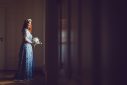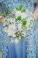 Ein zauberhafter Blütentraum in hellem Blau. Das „Couture Wedding Dress – Marlen“ wurde aus schimmernden Satin und einer wundervoll floralen Spitze gefertigt. Dabei wurden auf die bereits mit einigen Blüten besetzte Spitze unzählige weitere Blüten aufgebracht. Das Unterkleid besteht aus einer Korsage mit einem angesetzten, leicht ausgestelltem Rockteil aus Satin. Das Überkleid ist hochgeschlossen, figurbetont geschnitten und besitzt zarte Volantärmel. Auf dem Rücken befindet sich ein schmaler Ausschnitt der im Nacken von Blüten bedeckt mit einen Häkchen verschlossen wird. Das Kleid ist in der hinteren Mitte mit einem Nahtreißer zu schließen. Am oberen Rockteil ansetzend beginnt eine Schleppe über und über mit Blüten verziert. Am vorderen Rockteil lässt das Überkleid aus Spitze einen Blick auf den edlen Satin zu. An Schultern, Korsage und Rockteil wurden partiell gebündelt Blüten appliziert um so eine schöne Gesamtoptik zu erzielen.