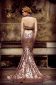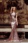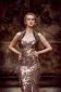 Schimmernde Pailletten reflektieren das Abendlicht in verschiedensten goldenen Nuancen. Übersät von unzähligen Glanzpunkten bestechen die „Glitter & Glamour“ nicht nur durch ihren besonderen Glanz sondern ebenfalls durch ihren figurbetonten, eleganten Schnitt. Dieses Kleid besitzt feine Kordelträger im Nacken und einen raffinieren Rückenausschnitt. Das Oberteil ist mit kleinen Falten im Vorder- und Rückenteil verziert. Wie kleine Blätter ranken sich die aus dem Stoff geschnittenen und applizierten Elemente über Brust, Taille, Hüfte und Rücken sowie den Übergang des Kleides zur Schleppe. Die Schleppe dieses Kleides ist über und über besät mit feinen Pailletten. Perfekt zu diesem Couture Kleid passend wird ein Loop als Stola getragen. Die Kordeln des Loops sind aus dem selben Stoff gearbeitet wie das Kleid. Ein feiner taupefarbener Jersey partiell besetzt mit kleinen Pailletten. Dieser elegant-feminine Look sorgt für einen glamourösen und glanzvollen Auftritt.