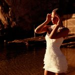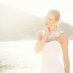 Sound of Ocean – White Klein aber fein. Wundervolles trägerloses Minikleid mit schönen Details aus weißem, gekreppten Seidenchiffon. Samtige Bänder zieren das mit Chiffon überzogene Unterkleid über Brust, Taille und Rücken. Verlaufend von der vorderen Mitte fließen die Bänder dekorativ strahlenförmig auseinander und sollen an Formen einer Muschel erinnern. Unterhalb des tiefsten Bandes setzt der…