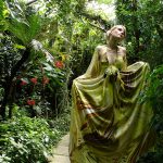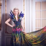 Hyazinth Federkleid Inspiration für die „Flying Rainbow“ Couture Collection lieferten die verschiedensten Papageien. Ihr Artenreichtum, ihre Vielfalt an Farben, Formen und ihr für unsere Gewohnheiten auffälliges und exotisches Aussehen, setzten Ideen frei, diese in der Mode umzusetzen. Langes rückenfreies Neckholderkleid mit langer Schleppe. Das Neckholderoberteil ist versehen mit kostbaren Mauserfedern von Papageien, in mühevoller Handarbeit…