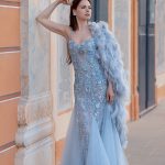 BLUE GEOMETRIC 3D FLOWER EVENING DRESS Himmlisches Blau, zarte bestickte & geometrische Spitze mit Perlen & Pailletten, funkelnde 3D Blüten mit Strass bezaubern jeden Betrachter dieses Kleides. Gekordelte Träger, die sich im Rücken kreuzen, halten dieses Kleid, das im Rücken einen kleinen Ausschnitt hat. Schmal geschnitten im Oberteil des Kleides, springt es im unteren Teil…