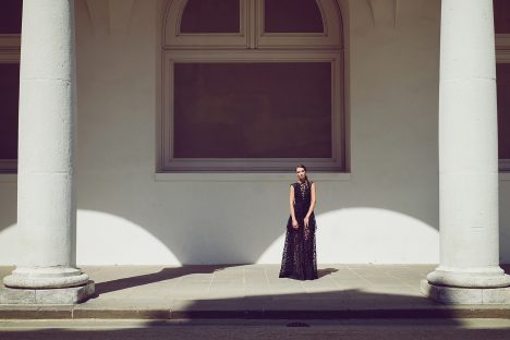 Als seien sie den Netzen einer Spinne entsprungen. So gestalten sich die Teile aus dieser aufsehenerregenden Couture Kollektion bestehend aus einem kurzen Kleid, einem Oberteil und einem langen Rock. Als Ausgangsmaterial diente ein leicht glänzender zarter Organza bestickt mit grafischen Mustern aus Garn. Der Hauch von Stoff wurde einfach und in mehreren Lagen verwendet, dabei teilweise durchbrochen mit Cut Outs wie in echten Spinnennetzen, die oft mehrfach ineinander verstrickt zu finden sind. Nicht nur Oberteil und Rock können zusammen getragen werden, sondern auch der lange Rock unter das kurze Kleid, für die Optik eines langen eleganten Abendkleides. – wie hier präsentiert von Stephanie Stumph zur Goldenen Kamera 2018.